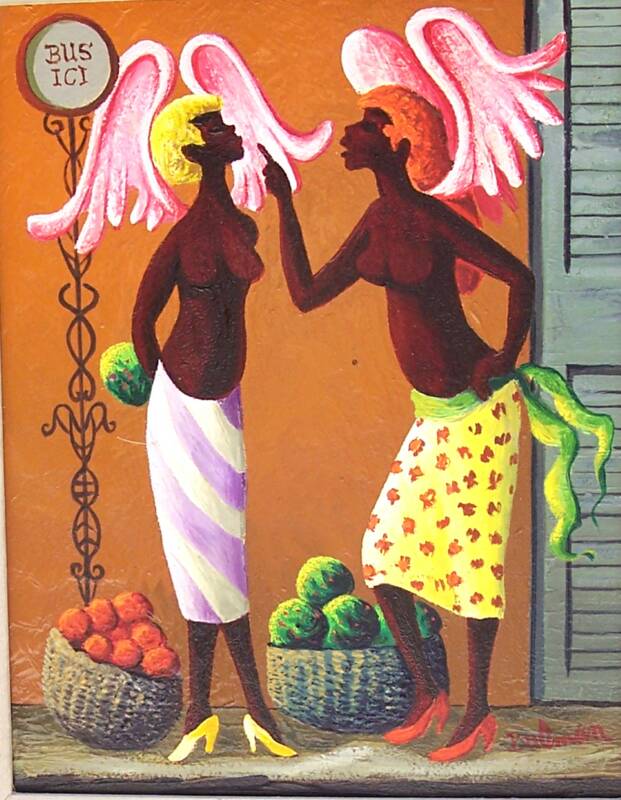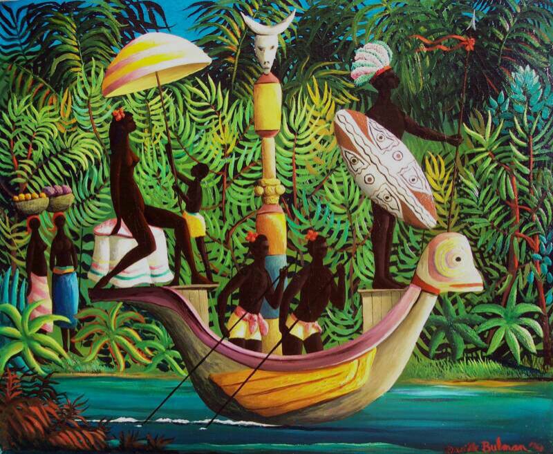 4. It was the Haitians' sense of humor and tremendous appreciation of his art that inspired and encouraged Bulman to develop into the artist he was to become. He did not consider them beneath him (as was inaccurately written in an old exhibition catalogue); he considered himself to be a part of their village (calling it "our village.") He liked and respected the Haitians very much and they liked him - it's all in his personal letters to his wife Jean. The women of the island fascinated Bulman. He admired them, thought they were remarkably elegant and graceful, and wrote about them in glowing terms: "The way they ride their tiny burriques - no duchess in all history every rode a charger more magnificently." Also, the reason Bulman paints just a slight hint of features on the people of color in his art is because he knew he wasn't a master of painting faces and realized that if he used the exaggerated features as he did for animals in his paintings, his islanders would look like caricatures, so he refrained from doing so. The Haitians told Bulman that his work did not make their people look bad as many artists did - especially Americans. Bulman argued in favor of their right to practice their religion--Voodoo--and appreciated and studied it at the National Museum of Haiti. One only needs to study his letters and/or read his biography to learn the truth.